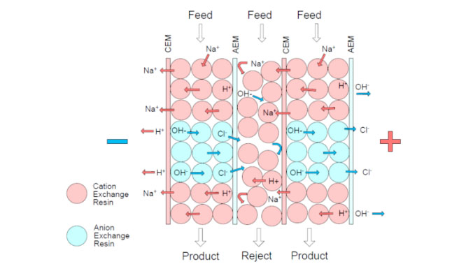 EDI(Electro deionization)是一種將離子交換技術(shù)、離子交換膜技術(shù)和離子電遷移技術(shù)相結(jié)合的純水制造技術(shù)。它巧妙的將電滲析和離子交換技術(shù)相結(jié)合,利用兩端電極高壓使水中帶電離子移動(dòng),并配合離子交換樹脂及選擇性樹脂膜以加速離子移動(dòng)去除,從而達(dá)到水純化的目的。